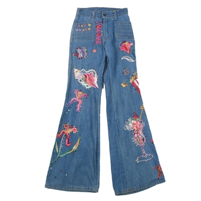 Tanya's 70s Vintage Bell Bottom Denim Jeans with Embroidery and Crystal Rhinestones