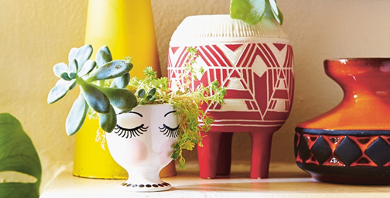Beautiful clay or ceramic pottery is another way to introduce the warm organic Southwest style into a space. Take your time hunting for vintage terra cotta or handmade vases, pots and dishes from the region. Then drop a succulent or cacti into them for instant life, use them as bookends, or on their own as décor.